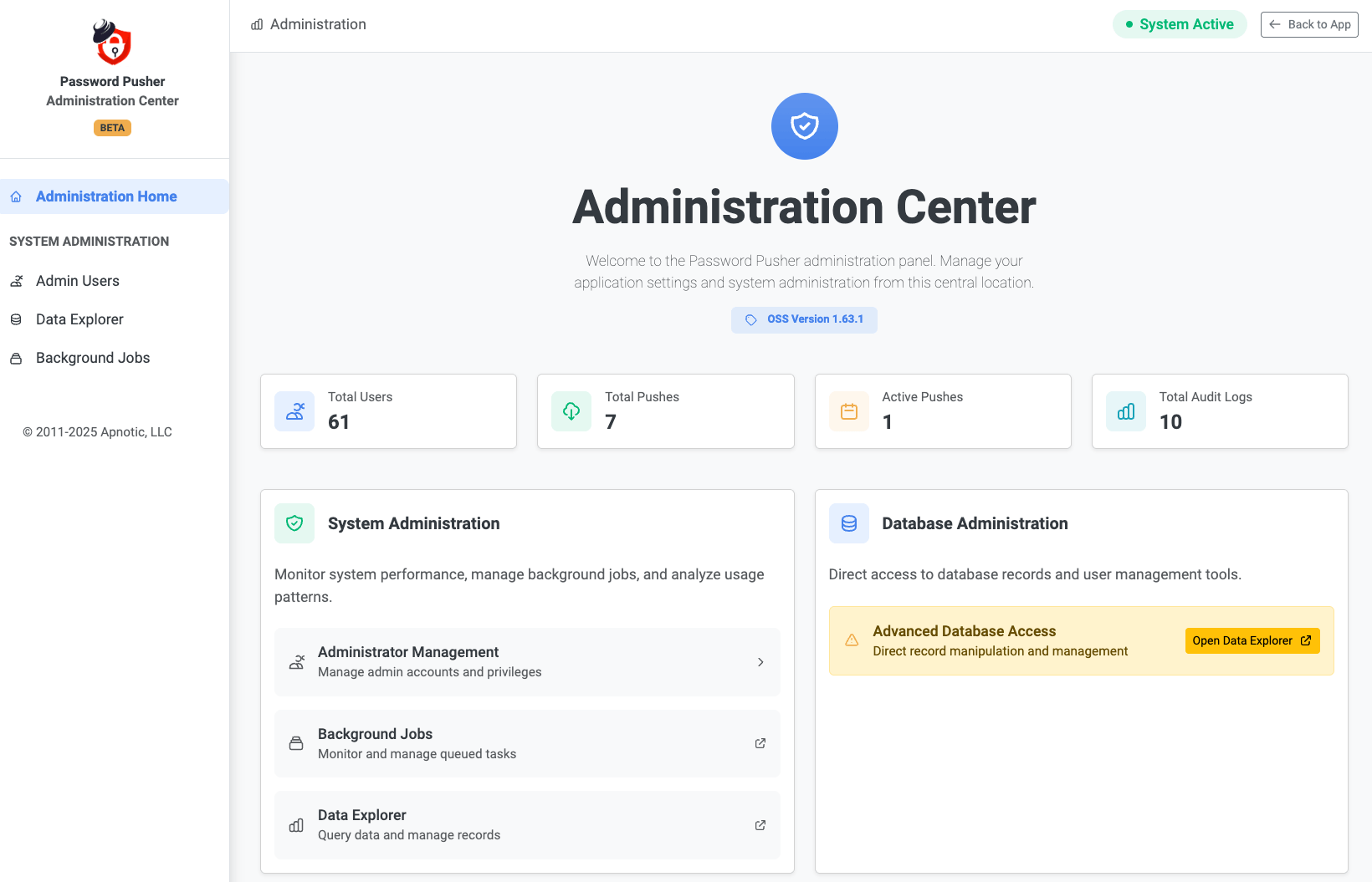 The Password Pusher Administration Dashboard provides a web-based interface for managing your self-hosted instance. It’s available at /admin and offers direct database access for viewing and managing pushes, users, and system settings.
